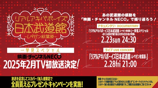 「映画・チャンネルNECO」では、日本武道館公演の映像を含む以下の2つの特集番組を放送予定です。