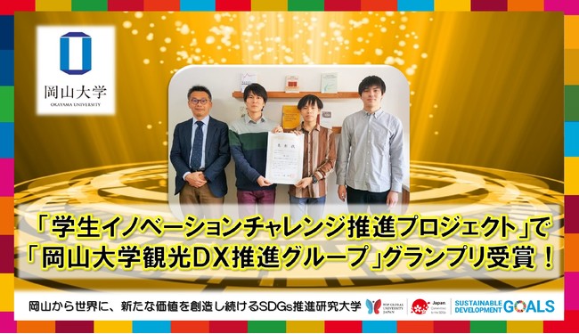 2022年2月19日、岡山市が主催する「学生イノベーションチャレンジ推進プロジェクト(令和3年度)」のソログループ部門で、国立大学法人岡山大学(本部:岡山市北区、学長:槇野博史)の学生らで構成する「岡山大学観光DX推進グループ」がグランプリを受賞しました。