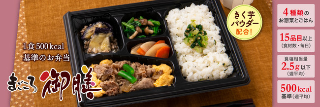 今回優秀賞を受賞した「まごころ御膳」は、4種のお惣菜とごはんがつき、1食あたり500kcal基準(5日間コース平均)、毎日15品目以上の食材、食塩相当量は2.5g以下(5日間コース平均)となっています。また、ごはんにはきく芋パウダーを炊き込んでおります。きく芋は“イヌリン”を多く含んでおり、糖の吸収をおだやかにしたり、腸内の善玉菌のエサになったりするなど、多様な働きをもった水溶性食物繊維です。