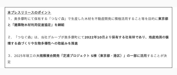 2.当社グループは、都内及びその近郊を中心とする、木材の安定供給のためのサプライチェーン構築により、「つなぐ森」において生産された木材を不動産開発事業等で利用するとともに、国産木材を活用した建築資材の研究開発も行うことで、脱炭素社会の実現に向けて、炭素貯蔵量の増加に取り組む。また、構築したサプライチェーンにおいて人権へ配慮するため、木材の各流通段階において労働環境等の把握を含むトレーサビリティの確保を行う。