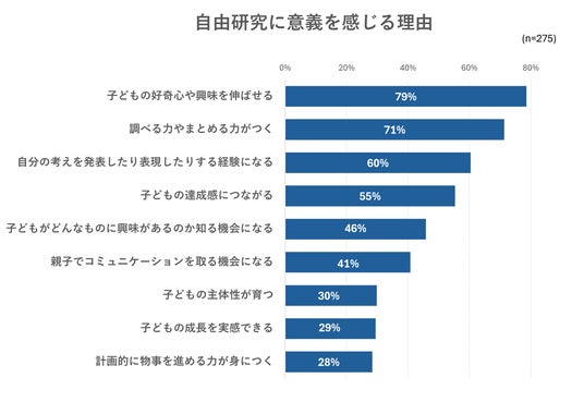 意義を感じる理由としては、「子どもの好奇心や興味を伸ばせる(79%)」「調べる力やまとめる力がつく(71%)」「自分の考えを発表したり表現したりする経験になる(60%)」といった、探究型学習としての学びや子どもの成長に期待が寄せられています。また、「子どもが何に興味があるかを知る機会になる(48%)」「親子で一緒に取り組むことでコミュニケーションが取れる(46%)」など、家庭内での親子の関わりを深めるきっかけと捉える声も多く見られました。