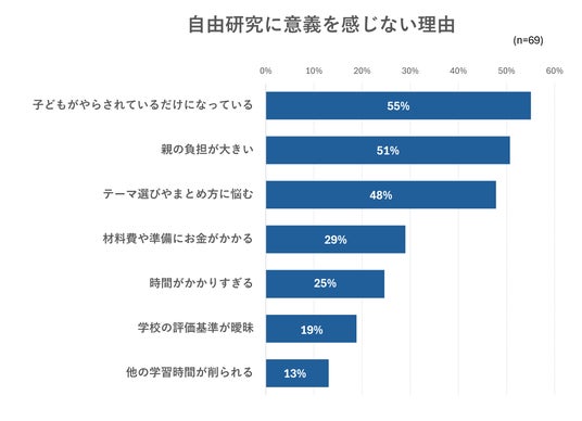理由としては、「子どもがやらされているだけになっている(55%)」という声や、さらに「親の負担が大きい(51%)」「テーマ選びやまとめ方に悩む(48%)」という回答も目立ちました。