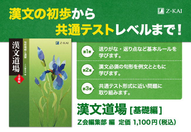 「第1章 導入編」では送りがな・返り点といった基本ルールを、「第2章 重要句形編」では重要句形を例文とともに学習します。基礎固めを重点的に行ったあとは、「第3章 総合編」で実戦問題に挑戦し、漢文の訓読・読解力が身についているかを確認します。