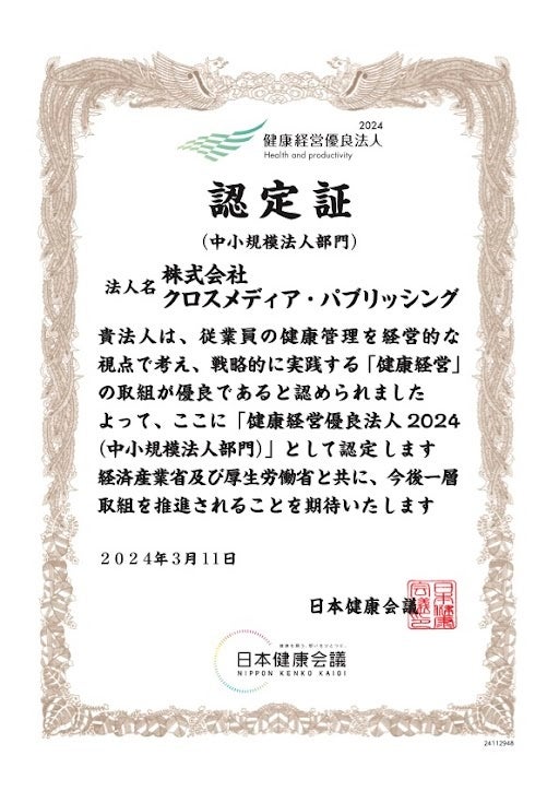 クロスメディアグループ株式会社(本社:東京渋谷区 社長:小早川幸一郎)のグループ会社である株式会社クロスメディア・パブリッシングと株式会社クロスメディア・マーケティングが、経済産業省および日本健康会議が共同で認定する「健康経営優良法人2024」に認定されました。今年度で4年連続となります。