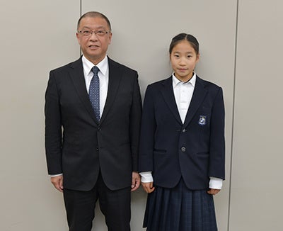 高槻市立第二中学校2年生の松浪ひかりさんが令和7年1月28日(火曜日)、市役所を訪問し、2月2日(日曜日)から長野県で開催される第45回全国中学校スケート大会のフィギュアスケート部門に出場する意気込みを西田誠教育長に話しました。