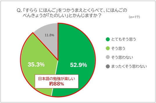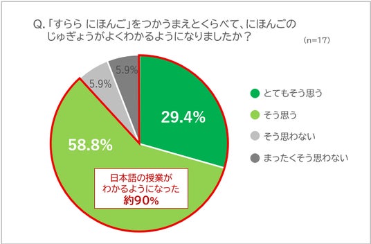 すららネットでは6月に、4月から日本語学習で「すらら にほんご」の活用を始めた生徒17人を対象に、アンケート調査を行いました。約88%の生徒が「すらら にほんご」の活用前と比べて日本語学習が楽しいと感じたと答えており、学習意欲が向上している様子がうかがえます。さらに、「すらら にほんご」を活用前と比べて授業がわかるようになったと答えた生徒は約90%、「すらら にほんご」は日本語学習の手助けになったと感じている生徒は約94%となり、たった2か月で早くも生徒たちが「すらら にほんご」による学習効果を実感していることがわかりました。