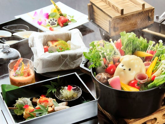 愛犬と同伴OKのレストランにて、ご夕食はお野菜たっぷりの健康お鍋を、朝食は和食をお召し上がりいただけます。また、愛犬専用ビュッフェもあり愛犬も退屈することなくお食事を愉しめます。