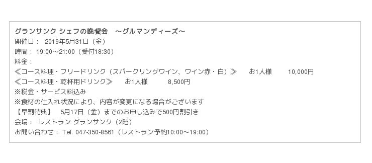 オリエンタルホテル 東京ベイ(千葉県浦安市 総支配人/森山 真也)では、日頃のご愛顧に感謝を込めて、5月31日(金)にレストラン グランサンクの滝口貴之料理長が、一夜限りの特別コースメニューでおもてなしする「グランサンク シェフの晩餐会~グルマンディーズ~」を初開催いたします。
