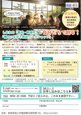 自然・人・地域とつながり、心と身体を癒す「ウェルネスツーリズム」は、日本のみならず世界中で新たな観光ニーズとして注目されています。島根県は、「ご縁も、美肌も、しまねから。」をテーマに、ウェルネスツーリズムに関心の高い旅行者に対して、魅力的な地域資源を活用した新たな滞在の形を提案するため、県内各地域で、観光事業者や宿泊施設、飲食店など向けに、以下の通り、第1回目のワークショップを開催します!10月以降に第2回目(松江・出雲・浜田予定)、1月には第3回目(県全体)のワークショップも開催予定です。たくさんのご参加お待ちしています。