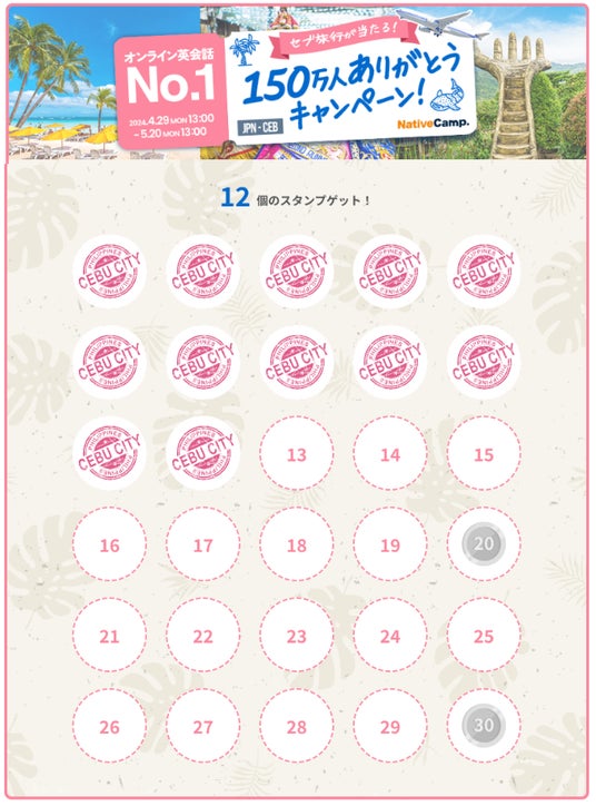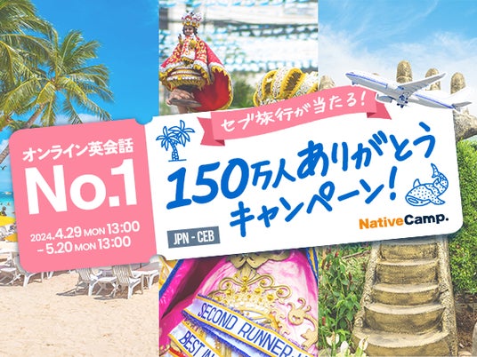 ネイティブスピーカーと回数無制限のオンライン英会話サービス「ネイティブキャンプ英会話」を展開する株式会社ネイティブキャンプ(東京都渋谷区 代表取締役:谷川国洋)は2024年4月29日(月)より、会員数150万人突破の感謝の気持ちを込めて「150万人ありがとうキャンペーン」を開催いたします。https://nativecamp.net/