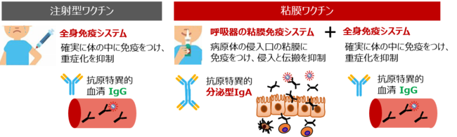 鼻から始まる呼吸器の粘膜面には、樹状細胞などの免疫細胞が各種存在し、病原体が侵入しようとすると免疫が作動して阻止する仕組みがあります。鼻から抗原を投与することにより、注射型と同じようにIgG抗体を血清中に確実に誘導するとともに、粘膜面に作用する分泌型IgA抗体も誘導できることが、これまでの基礎研究でわかってきました。