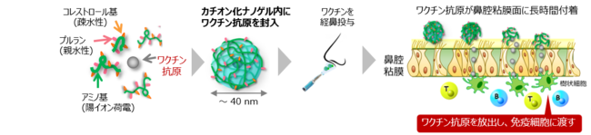 こうした課題の克服のため、本研究では、「カチオン化ナノゲル」内に封入したワクチン抗原を鼻から投与して粘膜面に届ける「噴霧型経鼻ワクチン」の開発を目指します。