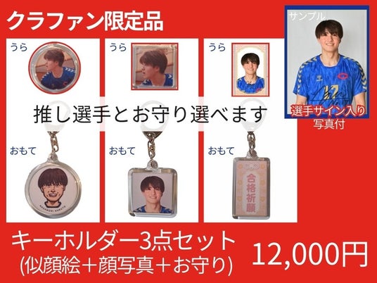 クラファンオリジナル!推し選手のキーホルダー3点と派遣選手7名それぞれのサイン入り写真7枚のセットです。お守りは5種類から選べます。