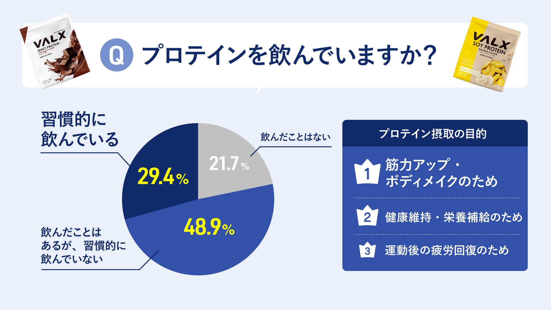 ・プロテイン飲用経験者は78%、習慣的飲用者は29%。