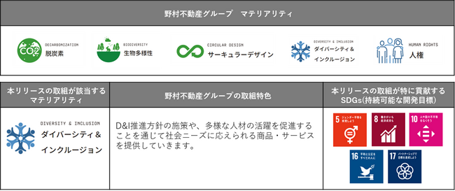 当社グループでは「野村不動産グループ ダイバーシティ&インクルージョン推進方針」に基づき、人種、民族、国籍、年齢、性別、性的指向、性自認、障がいの有無、宗教、信条、社会的身分、ライフスタイル、ライフステージ等、さまざまな属性においてすべての従業員がそれぞれの個性と能力を最大限に発揮し、多種多様な組織・人びとと共に手をとりあって挑戦し続けることで、新たな価値を創造していくためにダイバーシティ&インクルージョンを推進しています。