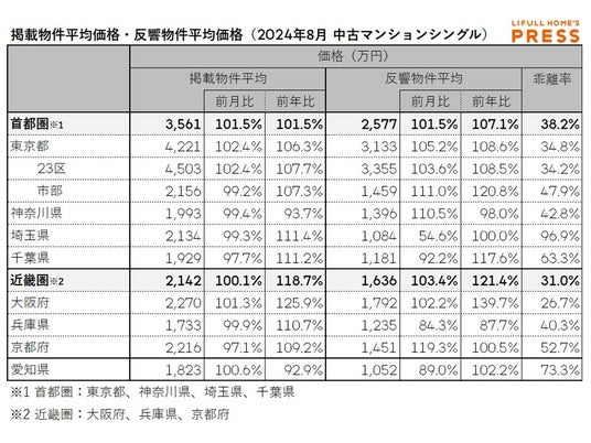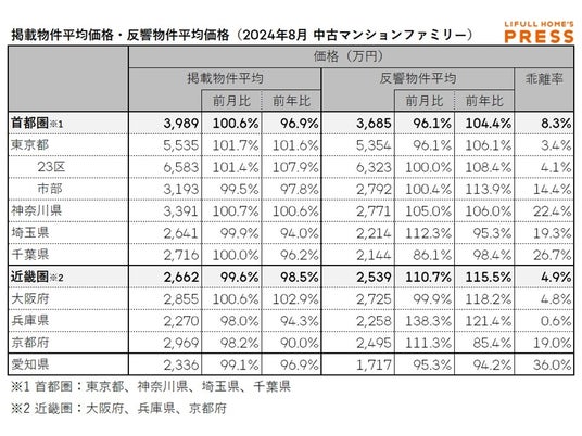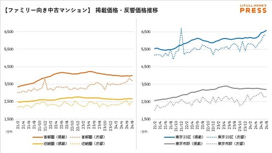 2024年8月の首都圏ファミリー向き中古マンションの掲載平均価格は3,989万円(前月比100.6%・前年比96.9%)、反響平均価格は3,685万円(前月比96.1%・前年比104.4%)、近畿圏ファミリー向き中古マンションの掲載平均価格は2,662万円(前月比99.6%・前年比98.5%)、反響平均価格は2,539万円(前月比110.7%・前年比115.5%)となった。
