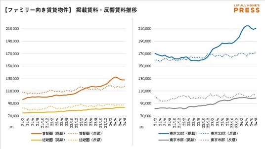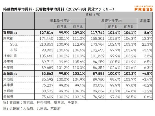 2024年8月の首都圏ファミリー向き賃貸物件の掲載平均賃料は12万7,814円(前月比99.9%・前年比109.3%)、反響平均賃料は11万7,742円(前月比101.4%・前年比104.1%)、近畿圏ファミリー向き賃貸物件の掲載平均賃料は8万3,862円(前月比99.8%・前年比103.1%)、反響平均賃料は8万7,853円(前月比100.0%・前年比102.3%)となった。