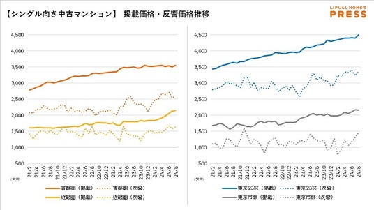 2024年8月の首都圏シングル向き中古マンションの掲載平均価格は3,561万円(前月比101.5%・前年比101.5%)、反響平均価格は2,577万円(前月比101.5%・前年比107.1%)、近畿圏シングル向き中古マンションの掲載平均価格は2,142万円(前月比100.1%・前年比118.7%)、反響平均価格は1,636万円(前月比103.4%・前年比121.4%)となった。
