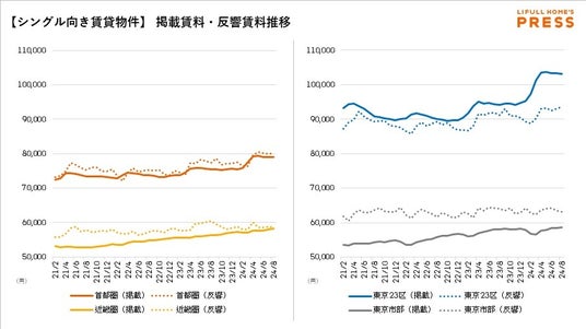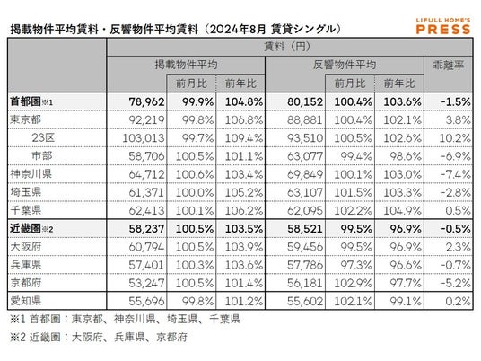 2024年8月の首都圏(東京都、神奈川県、埼玉県、千葉県)シングル向き賃貸物件の掲載平均賃料は7万8,962円(前月比99.9%・前年比104.8%)、反響平均賃料は8万152円(前月比100.4%・前年比103.6%)、近畿圏(大阪府、兵庫県、京都府)シングル向き賃貸物件の掲載平均賃料は5万8,237円(前月比100.5%・前年比103.5%)、反響平均賃料は5万8,521円(前月比99.5%・前年比96.9%)となった。