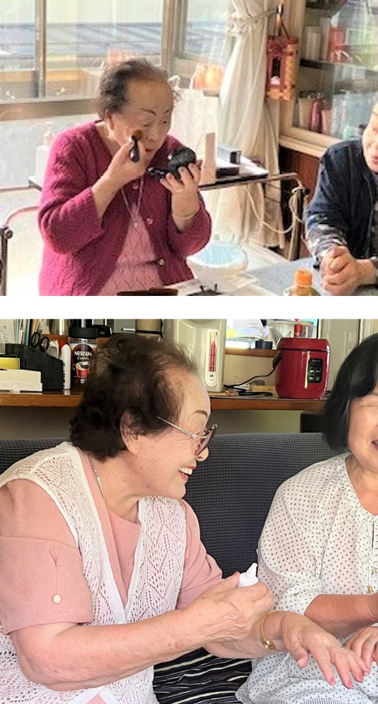 (画像上)メーク研修を受ける様子 (画像下)接客の様子