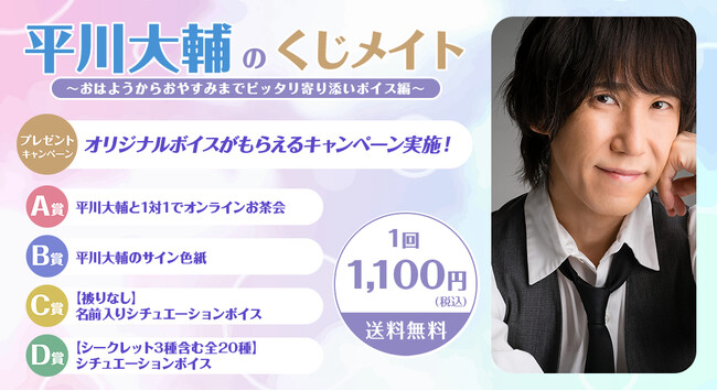 1月6日(金)より販売開始の「平川大輔のくじメイト~おはようからおやすみまでピッタリ寄り添いボイス編~」では、一日の始まりから終わりまでを平川さんと過ごすシチュエーションでの、平川さんの甘い寄り添いボイスが収録。