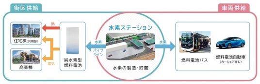 東京都都市整備局およびエネルギー事業者と連携し、周辺に整備される水素ステーションからパイプラインを通じて、各街区に設置される純水素型燃料電池に水素を供給し、共用部電力として活用しています。またAEMSによって、エリア全体でエネルギー需給状況を把握し、様々なエネルギー削減や最適化を実施しています。加えて、全住戸にエネファームを導入し電力自給率の高い住宅を整備することで、20%以上の省エネ効果を実現しています。こういった取り組みは、LEED-NDやCASBEE-街区において高い評価を受けました。