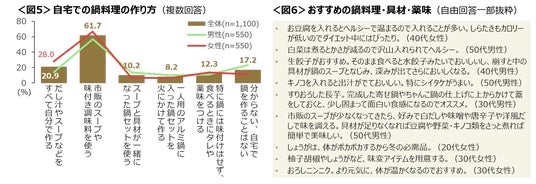 おすすめの具材としては、豆腐や白菜、きのこや餃子などヘルシーな食材やスープに深みがでるものなどがあげられた。おすすめの薬味としては、しょうがや唐辛子、ニンニク、柚子胡椒など、体が温まる、味変になるといった声もみられた。<図6>