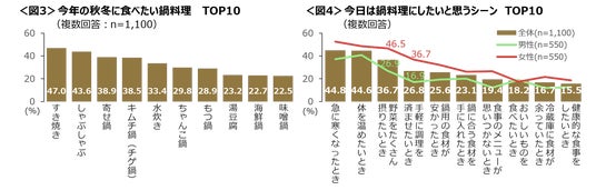 女性は鍋料理をしたいと思うシーンの回答が多く、特に「野菜をたくさん摂りたいとき」「手軽に調理を済ませたいとき」は男性より20ptほど高い。<図4>