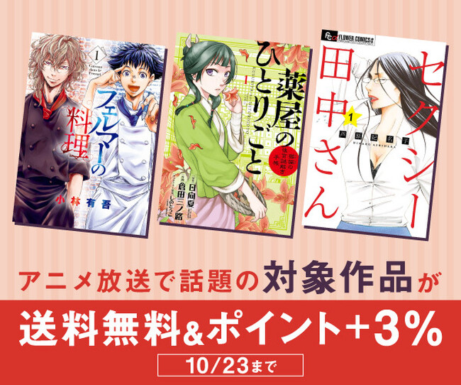 漫画全巻ドットコム本店では、秋のメディア化特集を公開中!さらに、『フェルマーの料理』『薬屋のひとりごと』など大人気のメディア化商品がお得に手に入るクーポンを配布しております!!!