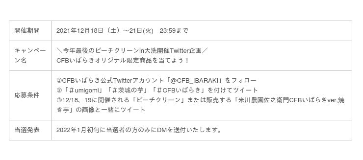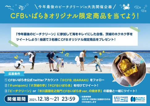 CHANGE FOR THE BLUE いばらき実行委員会は、12月18日(土)~21日(火)の期間中、Twitterキャンペーンを開催します。期間中にツイートをした方の中から抽選で3名様にCHANGE FOR THE BLUE いばらきオリジナル商品をプレゼント。期間中の18日、19日に大洗サンビーチで行われる「NIGHT WAVE~海のイルミネーションin大洗~」に先立ち実施する【今年最後のビーチクリーン】の写真や、同日販売する【米川農園佐之衛門CFBいばらきver.焼き芋】の写真と一緒にツイートしてください。