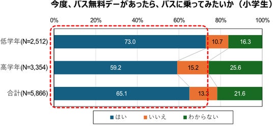 ・次回「バス無料デー」があればバスに乗ってみたいという小学生が、全学年で6割以上を占めた