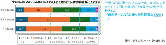 ・そのうち、1度もバスに乗ったことがない、または1~2回の乗車経験が極めて少ない小学生は15%だった