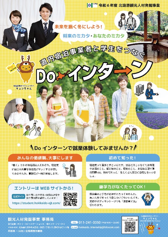 北海道と公益社団法人北海道観光機構では、宿泊業に興味をもっていただき、将来の就業につなげるため、就職活動を行っている、もしくは就職活動を始めようとしている学生を対象に、この冬、実際の宿泊施設の現場を体験・見学してもらう就業体験(インターンシップ)を実施します。