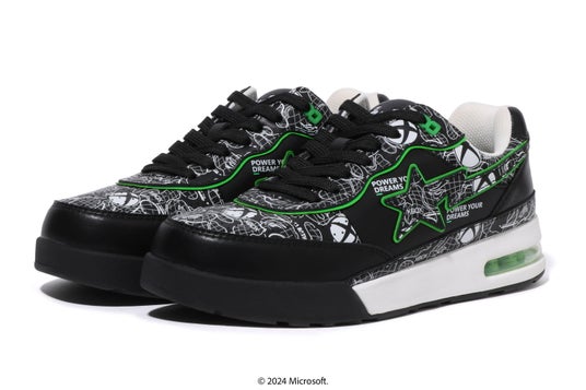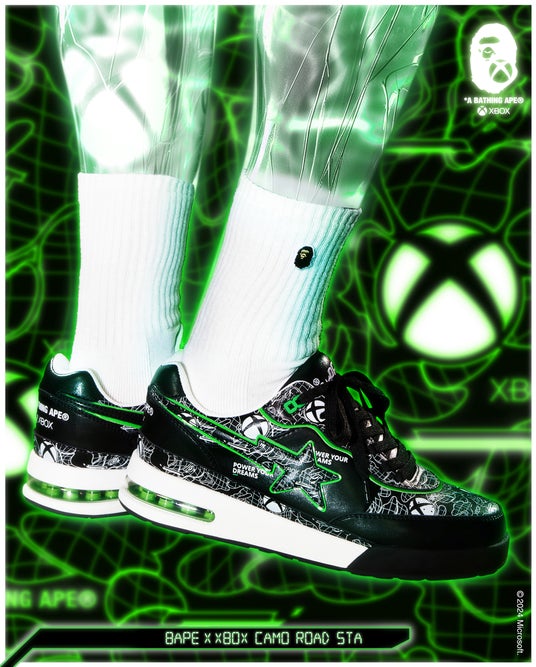 Tシャツ、ジップフーディー、ショーツ、キャップ、スニーカーの“ROAD STA”がラインアップし、Xboxのアイコンでアレンジした“APE HEAD”は、このコレクションにだけ使われる特別仕様となっています。