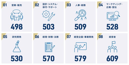 ・経営企画・事業開発に従事する職種はスコアが高い傾向 ・特定分野の知識・スキルが求められる職種はスコアが低い傾向