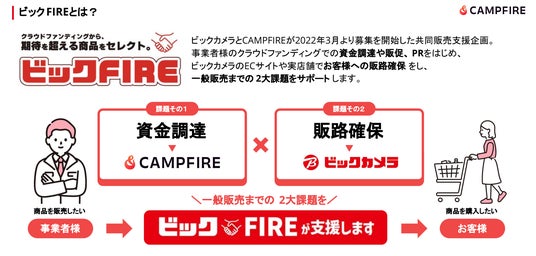 国内最大級のクラウドファンディングプラットフォーム「CAMPFIRE」を運営する株式会社CAMPFIRE(本社:東京都渋谷区、代表取締役:中島 真、以下CAMPFIRE)は、株式会社ビックカメラ(本社:東京都豊島区、代表取締役社長:秋保 徹、以下ビックカメラ)と共同で実施している販売支援プログラム『ビックFIRE』において、2026年度のエントリー受付を開始いたします。