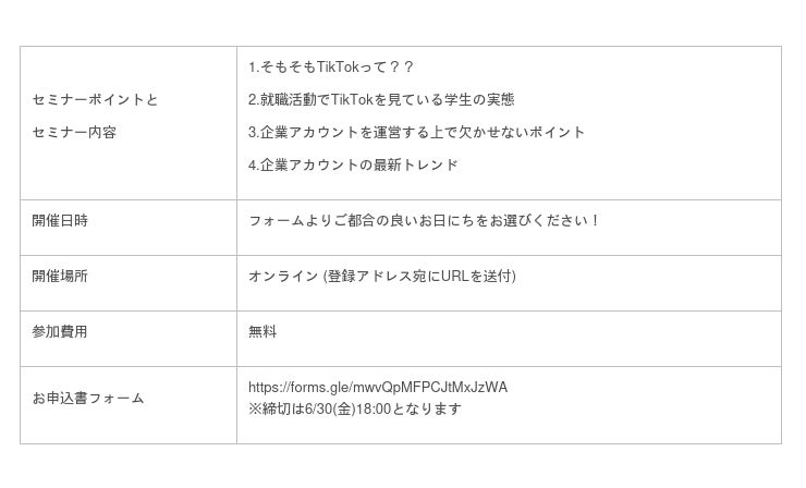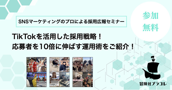 「PLACOLE & DRESSY」ブランドを展開する、冒険社プラコレ(本社:神奈川県鎌倉市、代表取締役CEO:武藤功樹)は、TikTokを活用した採用マーケティング術をご紹介する個別セミナーを開催いたします。