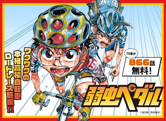 「弱虫ペダル」は、シリーズ累計100巻を突破した週刊少年チャンピオンで大好評連載中の本格高校自転車ロードレース巨編です。今回の無料対象は全てのめちゃコミックユーザー(アプリ・WEB)で、期間中は75巻分となる866話を無料で読むことができます。「毎日無料」は、毎日無料と表記されている作品を対象に1日で1話、もしくは複数話読み進めることが出来る機能です。「弱虫ペダル」においては1日最大12話読み進めることが出来ます。