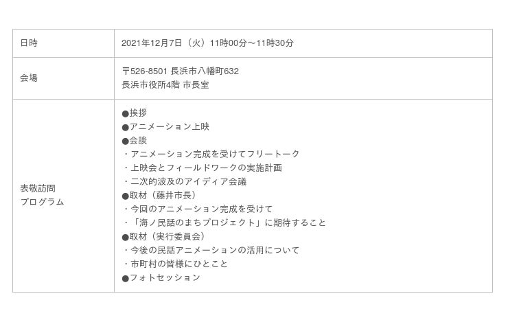 一般社団法人日本昔ばなし協会は、日本中に残された海にまつわる民話を発掘し、その民話のストーリーとその民話に込められた「想い」「警鐘」「教訓」を、親しみやすいアニメーションとして映像化しました。12月7日(金)長浜市役所にて滋賀県長浜市を舞台に制作されたアニメ「堀止地蔵」の完成報告を実施いたしました。