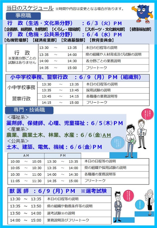 行政、小中学校事務、警察行政、土木、農業、林業、農業土木、建築、獣医師、薬剤師、保健師、心理、児童福祉、水産、電気、機械