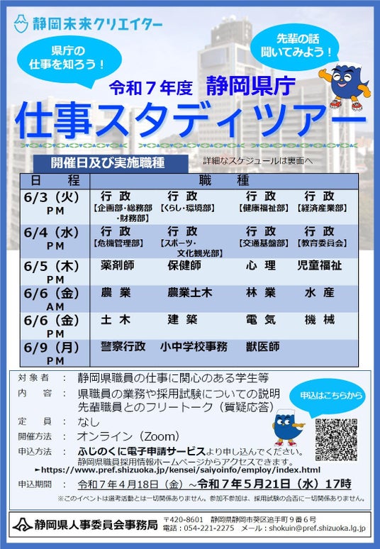 静岡県職員の仕事に関心があり、県職員採用試験の受験を検討している方を対象に、「静岡県庁 仕事スタディツアー」(採用説明会)を開催します。オンラインでの開催のため、ご自宅等から気軽に参加できます。