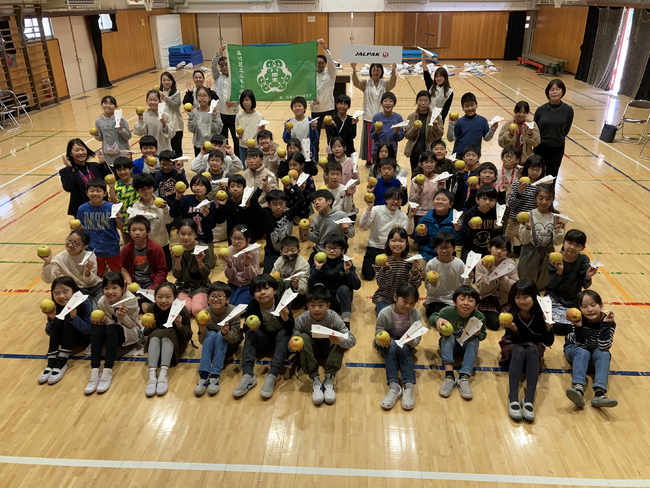 株式会社ジャルパック(本社:東京都品川区、代表取締役社長:江利川宗光)は、持続的な地域の活性化・観光関連産業の発展に向け、群馬県みなかみ町と連携した特別授業を、品川区の小学校において実施いたしました。これは、弊社がオーナーになっているりんごの木から収穫された珍しい黄色いりんご『ぐんま名月』を活用し、子どもたちにワクワクと学びを届けるべく、内容盛り沢山の特別プログラムを社員が小学校に出向いて実施したもので、授業当日、会場には子どもたちのたくさんの笑顔が溢れました。