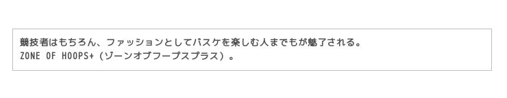 スーパースポーツゼビオ店内にて展開している、バスケットボールの新しいトレンドを提案するコーナー「ZONE OFHOOPS+(ゾーンオブフープスプラス)」。部活生の憧れるアイテムから、ファッションにも使えるこだわりのTシャツやキャップ、バックパック、シューズなど豊富な品揃えをしております。バスケファンなら一度は足を運んでおきたい注目のコーナーです。http://www.supersports.co.jp/zoh/