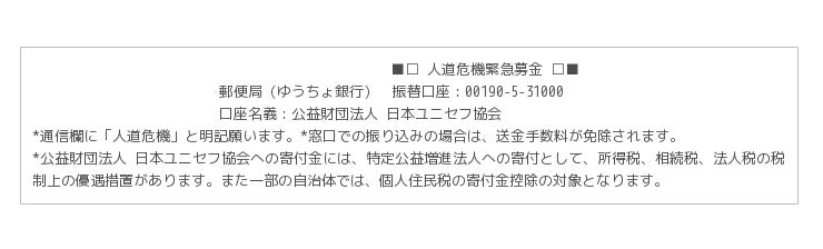 日本ユニセフ協会では、イエメンなど人道危機下にある国や地域で行われているユニセフの支援活動を支えるため、ユニセフ『人道危機緊急募金』を受け付けております。