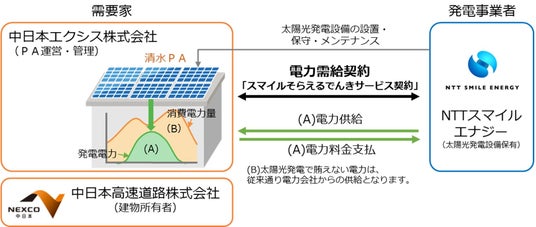 また、オンサイトPPAにより、NEXCO中日本や中日本エクシスは、初期投資および保守メンテナンスが不要であり、商用電力よりも安価に電力を購入できるため、電気料金を削減できるメリットがあります。今回、発電事業者として長期契約の実績が多数あるNTTスマイルエナジーと電力供給契約をし、「スマイルそらえるでんき」を導入します。