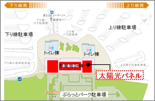 NEXCO中日本は、これまでも高速道路の各施設において太陽光発電を導入していますが、今回の太陽光発電設置面積は1,672平方メートル 、発電容量は254.1kWで高速道路SA・PAの商業施設としては最大規模となります。屋上全面に太陽光発電を設置することで、資産の有効活用が期待できるとともに、清水PAの商業施設棟の消費電力の約20%賄うことができ、20年間のCO2排出削減量はのべ約2,512t-CO2が見込まれ、脱炭素社会の実現に貢献するものと考えています。