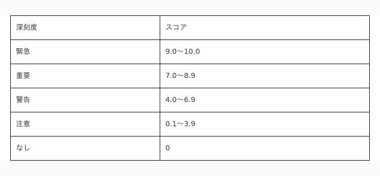 ※2 CVSS v3とは、ソフトウェアやシステム上の脆弱性に対する深刻度を評価するオープンかつ汎用的な指標です。CVSS v3では、深刻度レベル分けを次のように設定しています。