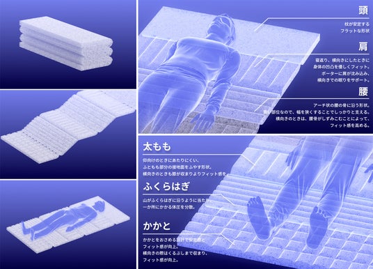 仰向けの体圧分散性だけでなく、横向けの体圧分散性にも優れ、睡眠時の一カ所にかかる圧力を分散し、体にかかる負担を軽減します。