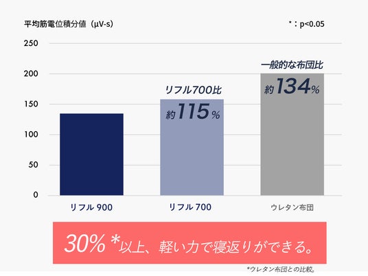 仰向けから横向きになることを5~9回繰り返し、うち3回の筋電位の積分値を解析。寝返り時の筋肉の稼働量を測る筋電データを計測したところ、一般的なウレタン布団に比べて、30%以上軽い力で寝返りが可能になることが分かりました。従来の「リフルマットレス700」と比べても、約15%改善しています※2。