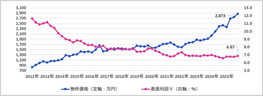 一方、平均利回りは物件価格が上昇したにもかかわらず、全種別で前四半期から上昇しました。特に都心部など賃貸需要の強いエリアを中心に賃料水準の上昇が進み、平均利回りを押し上げている可能性が考えられます。
